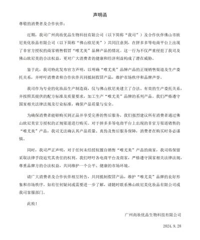 我司广州尚妆优品生物科技有限公司(以下简称我司)最近发现,部分经营者在其网站网店、微信公众号等平台上以及广告宣传资料中,公开使用我司的公司名称、公司简介、资质、荣誉、厂容厂貌和研发场所照片。 为此,我司郑重声明如下: